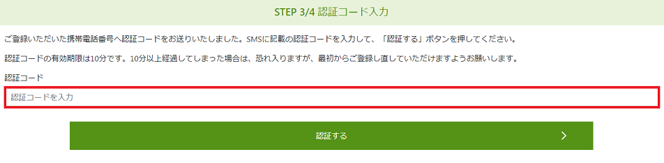 先ほど登録した携帯電話番号に、認証コードがSNSで届くので、届いた数字を入力して「認証する」をクリックします。