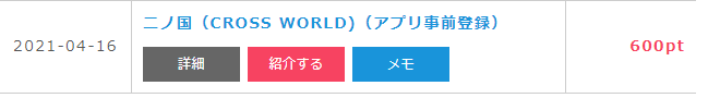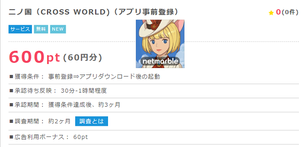 この記事で紹介する二ノ国(CROSS WORLD)(アプリ事前登録)は事前予約することで、ダウンロード&起動だけで通常では考えれない高ポイント(600ポイント)がもらえます。但し、ポイントが承認されるまで時間はかかります。それでも、お手軽なのでスマホを持っている方は利用してお金を稼ぎましょう(事前予約はパソコンからでも可能です)。