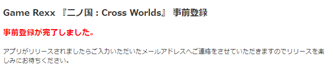 以上で「二ノ国(CROSS WORLD)(アプリ事前登録)」の事前登録は完了です。後は登録したメールアドレスにGameRexxからメールが配信されるので配信されたメールに記載のURLからアプリをダウンロード&起動で600ポイント(60円相当)を獲得することができます。