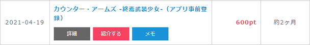 この記事で紹介するカウンター・アームズ -終焉武装少女-事前登録は事前予約して、ダウンロード&起動だけで通常では考えれない高ポイント(600ポイント)がもらえます。但し、ポイントが承認されるまで時間はかかります。それでも、お手軽なのでスマホを持っている方は利用してお金を稼ぎましょう(事前予約はパソコンからでも可能です)。