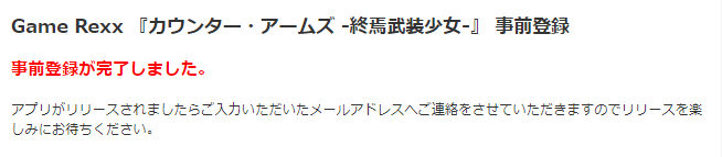 以上で「カウンター・アームズ -終焉武装少女-(アプリ事前登録)」の事前登録は完了です。後は登録したメールアドレスにGameRexxからメールが配信されるので配信されたメールに記載のURLからアプリをダウンロード&起動で600ポイント(60円相当)を獲得することができます。
