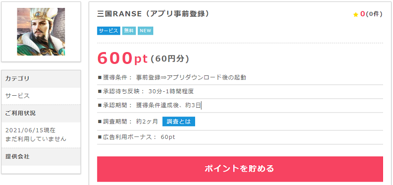 この記事で紹介する「三国RANSE(アプリ事前登録)」を事前予約することで、ダウンロード&起動だけで通常では考えれない高ポイント(600ポイント)がもらえます。但し、ポイントが承認されるまで時間はかかります。それでも、お手軽なのでスマホを持っている方は利用してお金を稼ぎましょう(事前予約はパソコンからでも可能です)。