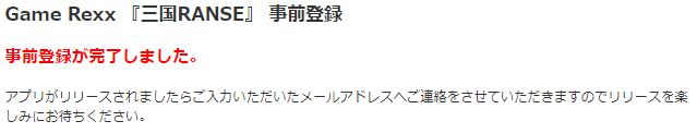 以上で「三国RANSE(アプリ事前登録)」の事前登録は完了です。後は登録したメールアドレスにGameRexxからメールが配信されるので配信されたメールに記載のURLからアプリをダウンロード&起動で600ポイント(60円相当)を獲得することができます。