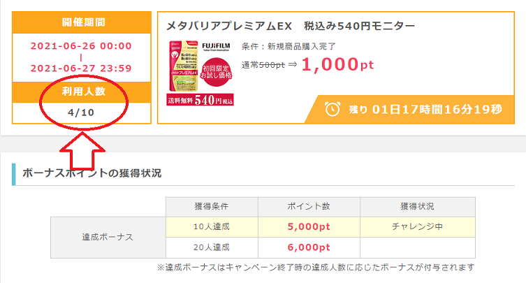 みんなでチャレンジは、利用者数に応じてボーナスポイントがもらえるのですが、メタバリアプレミアムEXは20名利用でボーナス達成となり、6月26日6時時点ではまだ4人の方しか利用していませんが、前回が300人以上の方が利用しているので、今回も条件をクリアできると思いますが、不安な方は利用者数が20人を超えてから利用しましょう。商品を購入してポイントが承認されるとボーナスとして6,000ポイント(600円相当)がプレゼントされますので、最終的に160円のお小遣いを稼ぐことができます。