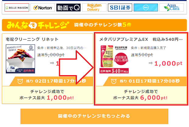 掲載されていたのは「みんなでチャレンジ」コーナー、条件をクリアすることで700円分のポイントが還元されるので、メタバリアプレミアムEXを購入しても160円のお小遣いを稼ぐことが出来る広告として多くの方が利用しました。