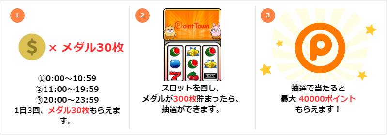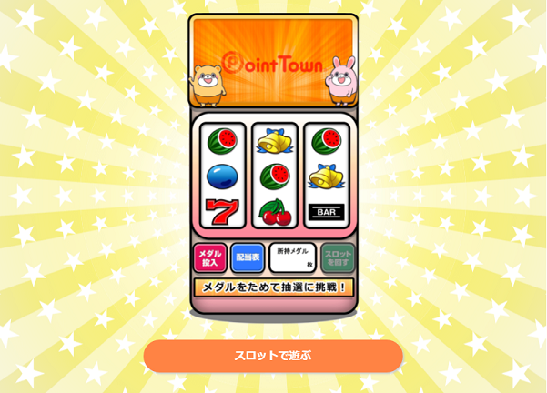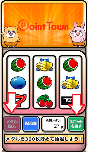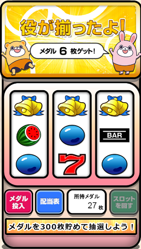 - スロットゲームに参加して、メダルが300枚貯まるとポイントが当たる抽選に挑戦できます。
