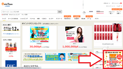 ポイントタウンのトップページの気がつかないようなところにスロットボックス β版登場のお知らせがあります。