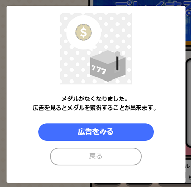 広告を見てメダルをもらえるのは2回ぐらいなので、そうなってしまったら、次にメダルが配布される時間まで待って再度スロットに挑戦しましょう。