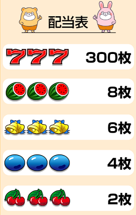 但し、配当表を見ると「777」以外の子役はもらえるメダルが少ないので、「777」が当たるのを待つゲーム性だと言えます。