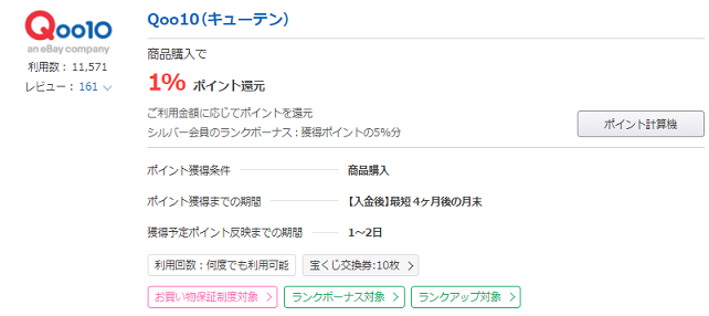 人気のQoo10の還元率は通常1%ですが、20%増量されるので1.2%還元で利用できます。