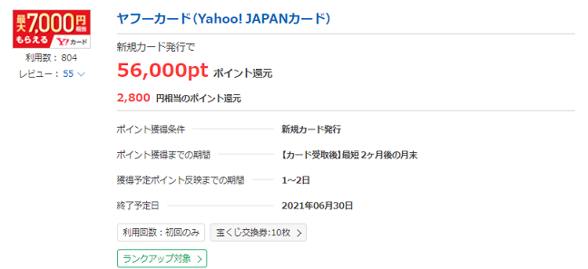 また、Yahoo!ショッピングを利用される方に人気の「ヤフーカード(Yahoo! JAPANカード)」も、通常56,000ポイント(2,800円相当)ですが、7月1日なら20%増量されて67,200ポイント(3,360円相当)にアップするのでカード発行は7月1日に行いましょう。