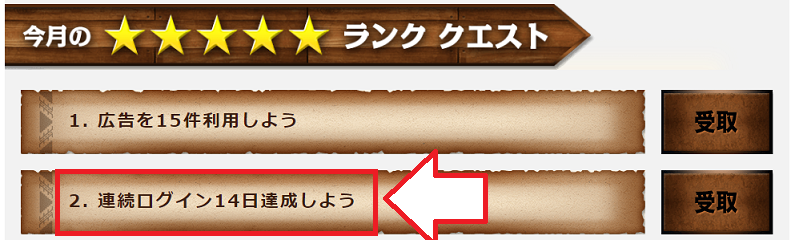 クエストランク最上位の星5つのクエストに「連続ログイン14日達成しよう」があります。ただ14日間連続でログインするだけで良いのでクリア条件としては緩いです。