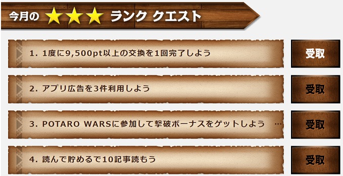 2・3・4に関しては、POTARO WARSが最難関となっているので、クリアできたらラッキー程度に思って参加してみましょう。又は30,000ポイント以上の広告利用を予定している方は、POTARO WARSに合わせて利用しましょう。そうすることでクリアできますからね。
