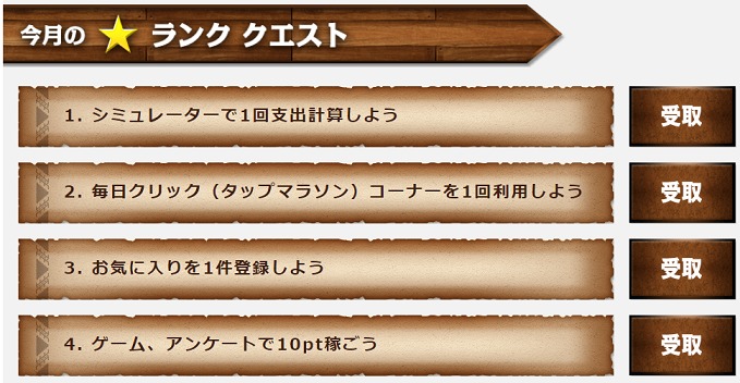 簡単なクエストだけを毎月狙ってクリアするだけでもそれなりのポイントを獲得することができるので、慣れるまでは簡単なクエストを狙ってボーナスを手にしましょう。