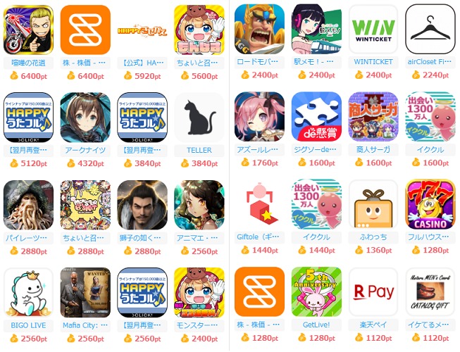 がっつりポイントを貯める事ができるアプリも多数掲載されていますが、プレイ時間が2週間以上かかるものもあるのでゲームが好きな方向きです。