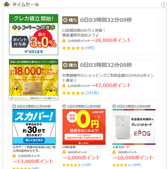 ちょびリッチのトップページには、タイムセールとして、いつもより多くのポイントがもらえる広告の掲載があるので、そこに掲載されている広告を利用するのが条件クリアの近道となります。