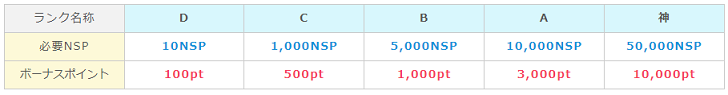 - 「ランクアップ」ボタンを押下しなかった場合でも、最終獲得NSPに応じたランクでのボーナスポイントが付与されます。