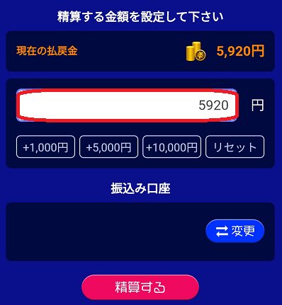 500円以上なら10円単位で清算できるので、5,920円全て清算します。金額を入力したら「清算する」をタップします。