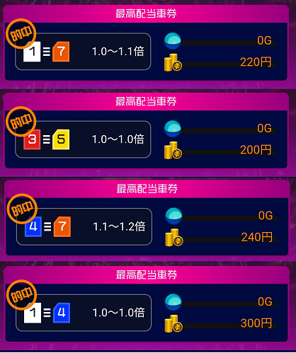 そして今回も回収率100%を目指してワイド車券を購入します。そしてTIPSTARからしばし離れることにしました。何故なら、友情ガチャや、ガチャでコツコツTIPマネー(仮想現金)が貯まるのが魅力でしたが、最近ではほぼTIPマネーが貯まらなく改悪されました。特にガチャの改悪が酷く時間の無駄のような結果にしかならないので、少し改善されるまで毎日のアクセスを控えます。但し、毎週土曜日から月曜日までは投票することでTIPマネーが50円分もらえるので、それだけは参加するつもりです。