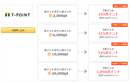 ポイントタウンでは、Tポイントへの交換は2,000ポイント(100円相当)から交換できるので、今からポイントタウンを始めても余裕で貯めることができます。