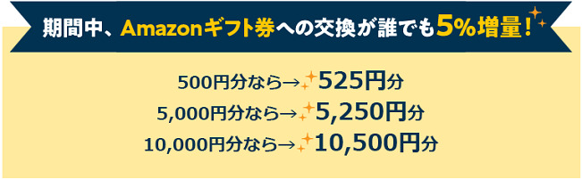 仮に1万円分のポイントを交換すると10,500円のAmazonギフト券となります。