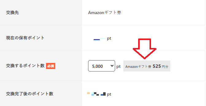 5,000ポイント(500円相当)をAmazonギフト券へ交換した場合、しっかり525円分のAmazonギフト券へ交換できることを確認しましょう。