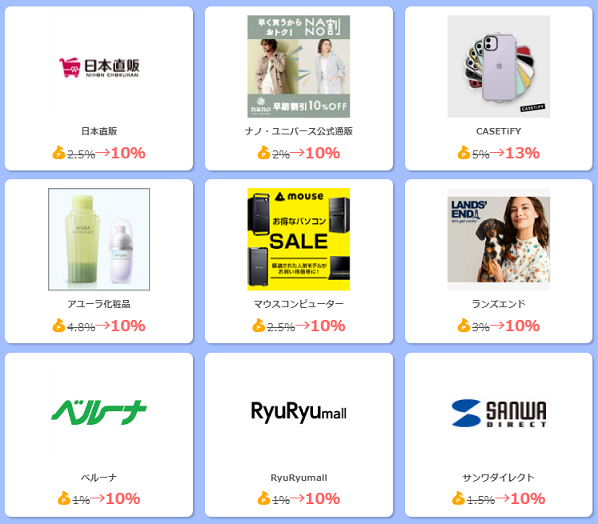 タイミングよく利用予定のショップが対象となっている場合は、他のポイントサイトを利用するよりもお得に利用できるチャンスとなっています。