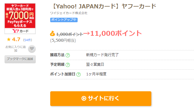 現在、ポイントサイト【ちょびリッチ】に掲載されているヤフーカードに申し込むと11,000ポイント(5,500円相当)のポイントがもらえるます。