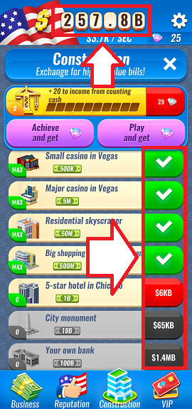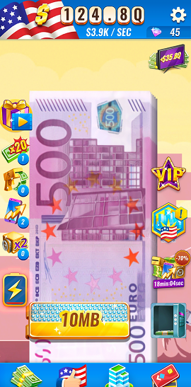画面中央にあるお札をタップしてお金を貯めて、建物を建設するゲームですが、お札タップだけでクリアを目指すと途方も無い時間がかかります。