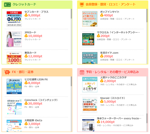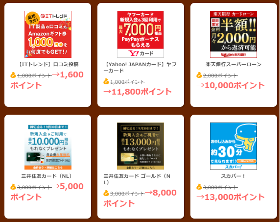 対象となる広告は「登録・申込み」なので、無料会員登録やクレジットカード発行、FX口座などが対象となっているので、1万ポイントを貯める場合は、クレカの発行など高額ポイントが期待広告を利用する必要があります。
