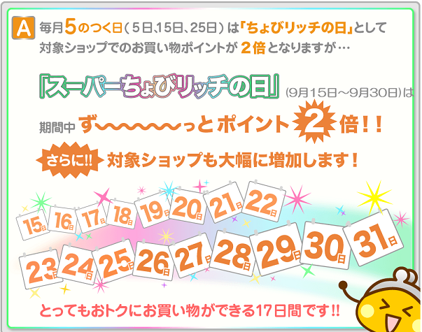 毎月5のつく日(5日、15日、25日)は「ちょびリッチの日」として対象ショップでのお買い物還元ポイントが2倍となるスペシャルデーとなっていますが、『スーパーちょびリッチの日』は2021年9月15日~9月30日までの17日間連続で行われるお買い物イベントです。