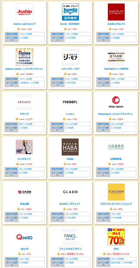 残念ながら期待していた「Yahoo!ショッピング」の掲載はありませんでしたが、「Qoo10」や「ニッセン」など利用価値の高いショップの還元率が2倍となっています。