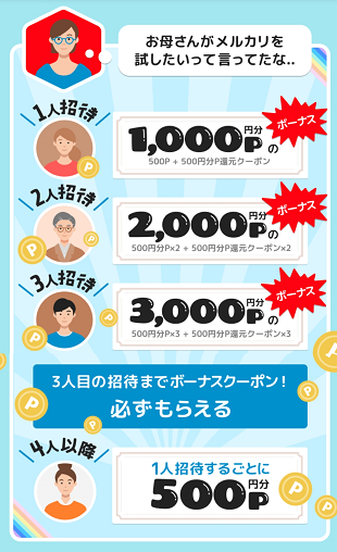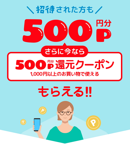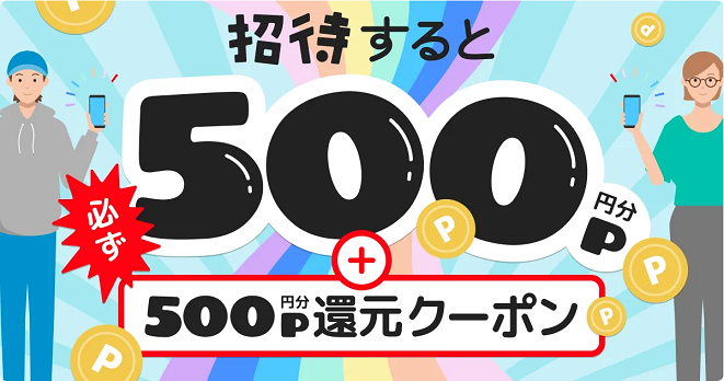 「招待した人もされた人も必ずP500とP500還元クーポンもらえる!」内容