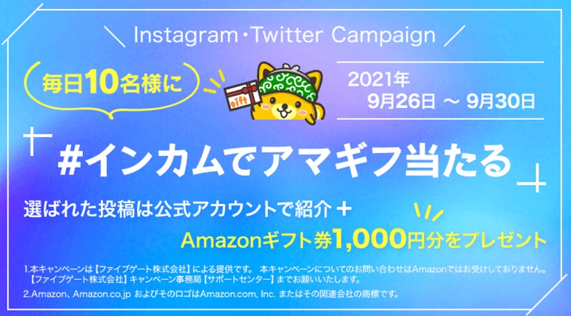 キャンペーン概要:#インカムでアマギフ当たる のハッシュタグと紹介コードをいれてInstagramまたはTwitterで投稿すると、投稿してくれた方の中から毎日10名様にAmazonギフト券1,000円分がプレゼントされます。