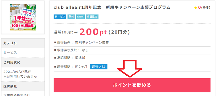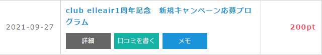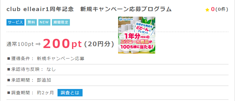 ポイントインカムに掲載されている「club elleair1周年記念 新規キャンペーン応募プログラム」からキャンペーンに応募することで200ポイント(20円相当)が即もらえます。キャンペーンにハズレてもポイントはもらえるので、応募される場合はポイントインカムがおすすめです。