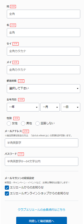 全てに入力したら「同意して確認画面へ」をクリックします。