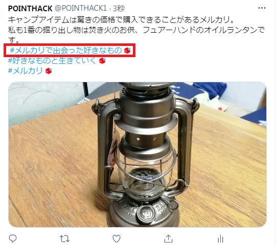 私は、趣味のキャンプで使うフュアーハンドのオイルランタンの写真と一緒に指定ハッシュタグ「#メルカリで出会った好きなもの」を付けてツイートしてきました。