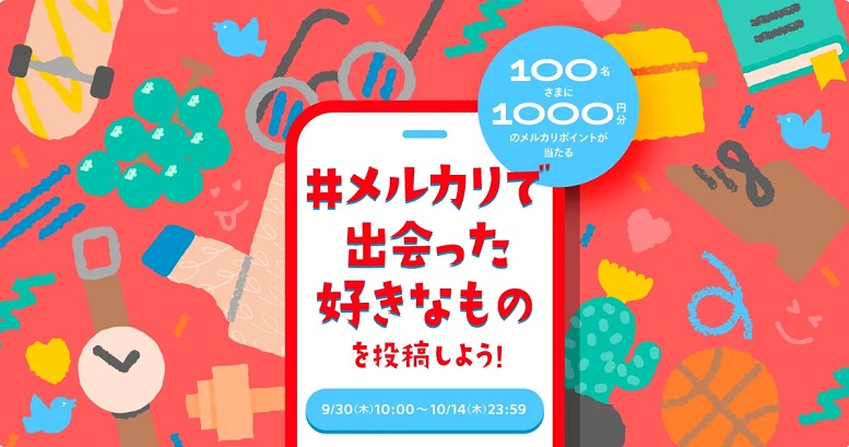10月14日までに、メルカリ公式Twitterアカウント(@mercari_jp)では「#メルカリで出会った好きなもの」投稿キャンペーンが開催されています。「自分がメルカリで出会ってよかったアイテムがある」という方はメルカリ公式Twitter(@mercari_jp)アカウントをフォローして、「#メルカリで出会った好きなもの」をつけて商品名や写真を投稿してください。抽選で100名さまに1,000円分のメルカリポイントがプレゼントされます。