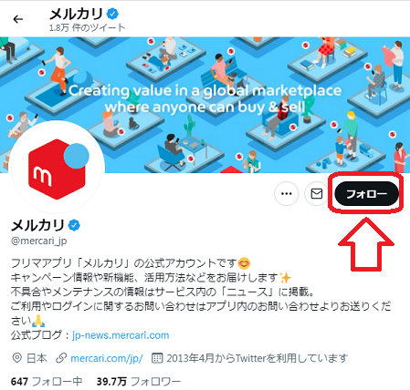 メルカリ公式Twitterアカウント(@mercari_jp)をフォローします。