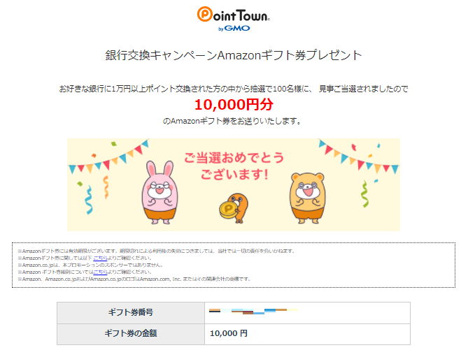 そんなポイントタウンで2021年9月17日(金)~2021年9月20日(月)に開催されていた「銀行へ1万円交換するとAmazonギフト券1万が当たる!」キャンペーン。