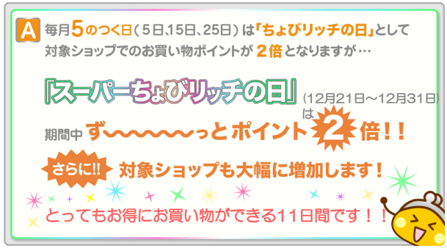 毎月5のつく日(5日、15日、25日)は「ちょびリッチの日」として対象ショップでのお買い物還元ポイントが2倍となるスペシャルデーとなっていますが、『スーパーちょびリッチの日』は2021年12月21日~12月31日までの11日間連続で行われるお買い物イベントです。
