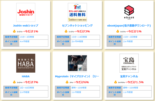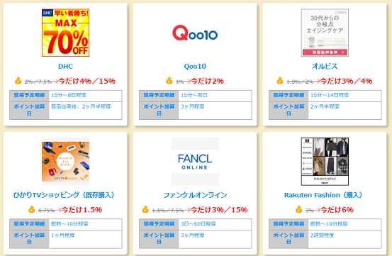 残念ながら期待していた「Yahoo!ショッピング」の掲載はありませんでしたが、「Qoo10」や「ひかりTVショッピング」など利用価値の高いショップの還元率が2倍となっています。