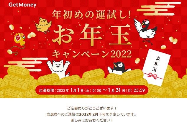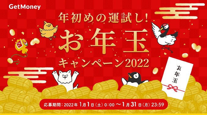 ポイントサイト【GetMoney!】でも簡単応募で最大1等100,000ポイント(1万円相当)が当たる「年初めの運試し!お年玉キャンペーン2022」が開催中されています。