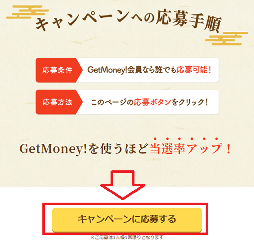応募はワンクリックと簡単です。GetMoney!会員なら即応募できますし、まだ登録されていない方も登録したら即応募できるので1万円を当てたい方はGetMoney!に登録しましょう。