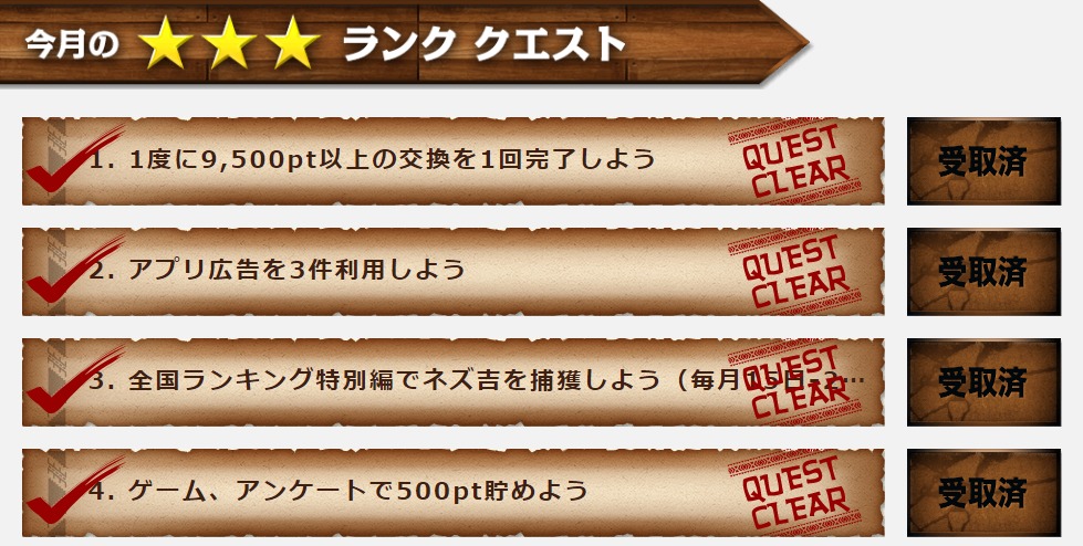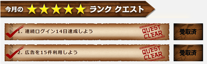 さらに、全てのクエストをクリアした者だけが挑戦できる最上級クエストをクリアすると5,000ポイント(500円相当)がプレゼントされるので、毎月1,000円分のボーナスを狙えるコンテンツとなっています。