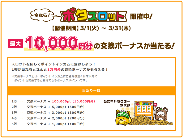 ポイントインカムで貯めたポイントを5月末までに交換することでポタスロットで獲得したボーナスポイントが貰えるので、スロットに挑戦したら必ず5月末までにポイントを交換しよう。