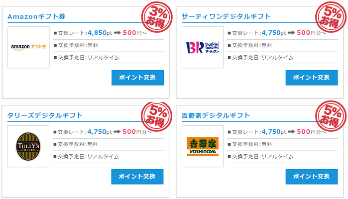 - サーティーワンデジタルギフト:475円相当のポイントで500円分に交換可能