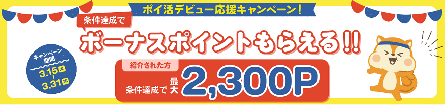 キャンペーン期間中に友達紹介で入会し、2022年3月31日(木)までに300ポイント以上の広告を1件以上利用で300ポイントがもらえます。入会の翌々月末までに5,000ポイント以上獲得でもらえる2,000ポイントと合わせて、最大2,300ポイント(2,300円相当)がもらえます。
