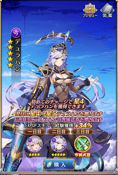 「デュラハン」を入手することで、放置時の経験値が最大34%アップするので、報酬を目指す場合は必須の課金になるようですので、あまり悩まず課金して「デュラハン」を入手しましょう。3日目には専属武器も貰えるので鍛えるキャラも「デュラハン」で決定となります。
