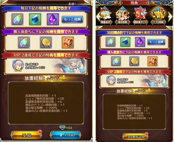 私がプレイを開始したときには「3日無料試用」があったので、今は無料期間中ですが、プライム特典を購入することで放置時の経験値が50%アップルするので「デュラハン」と合わせて最大84%も獲得経験値が増えます。